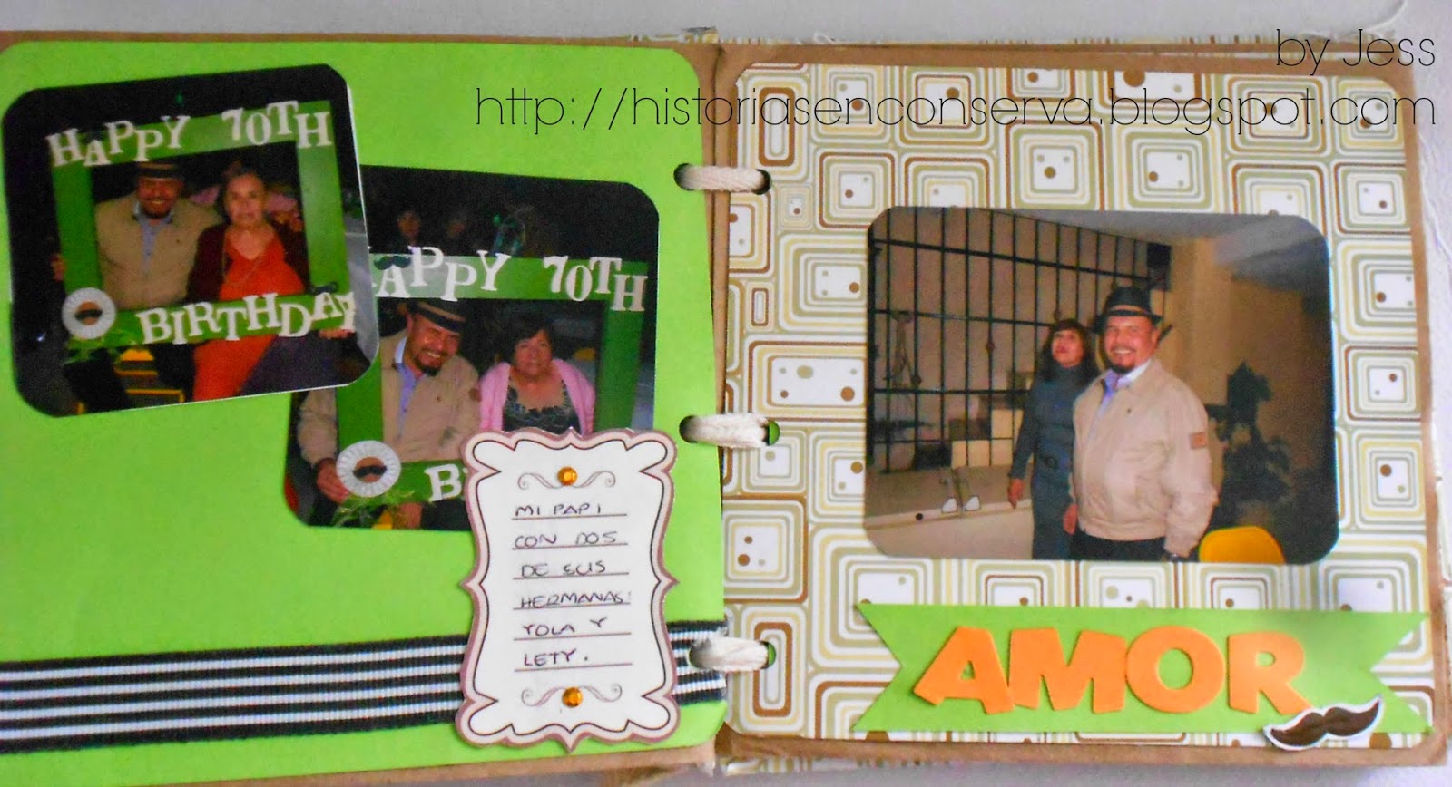 En esta ocasión hice un mini de los de bolsas de papel o mini paper bag, como también se les llama. Usando las fotos del cumple de mi papi. Usé este papel de cuadritos que me encanta, puse solo el título en letras de madera, agregué el famosísimo mostacho y uno con distintos listoncitos.